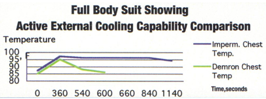 實驗條件:工作人員身穿不同防護服,以3.5英里/小時的速度在跑步機上慢跑3分鐘后測量全身防護服的溫度,再隨時間推移不斷測量防護服內的溫度變化。藍色曲線代表通用防護服,綠色曲線代表使用Demron材料制成的防護服。